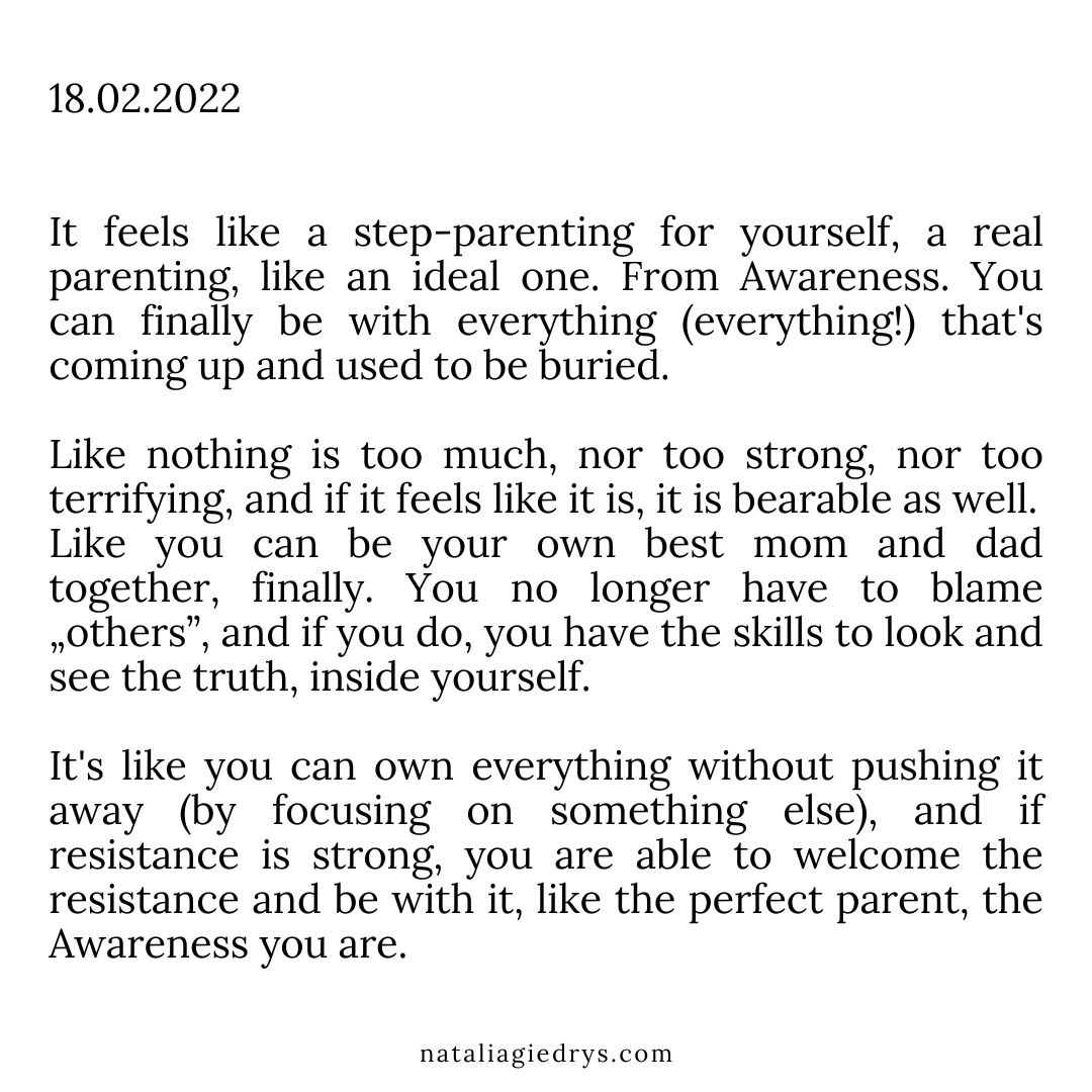 Gdy poprzez inquiry wydobywasz związki ciało-umysł: nieuświadomione myśli i mechanizmy złączone z energiami w ciele i dzięki temu odnawiasz autentyczne połączenie ciało-umysł, wtedy zaczynasz słuchać siebie naprawdę. Zaczynasz widzieć siebie naprawdę i zaczynasz czuć siebie naprawdę. Uświadamiając sobie prawdziwego siebie. Krok po kroku bardziej i głębiej.